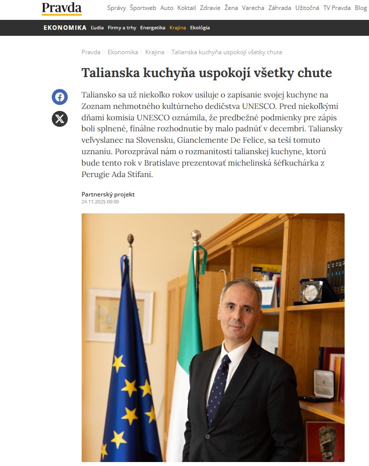 Týždeň talianskej kuchyne vo svete 2025. Talianska kuchyňa: zdravie, kultúra a inovácie – rozhovor s veľvyslancom De Felicem uverejnený v denníku Pravda.